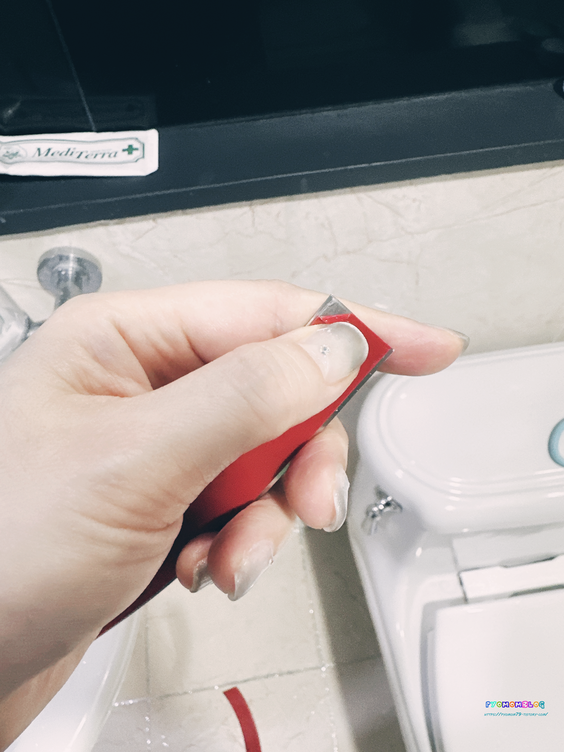 뒤쪽에 있는 빨간면을 떼어내면 접착 부분이 나오니